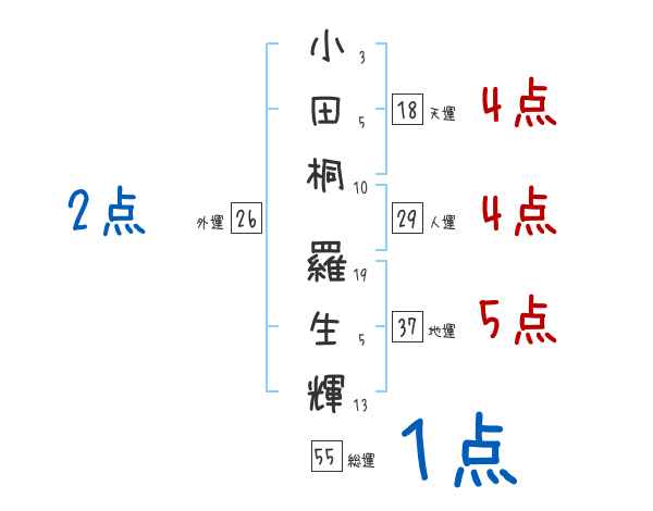 天運![]() | 小田桐羅生輝さんの天運は18画の4つ星!情熱的で剛気。忍耐力があり信頼される。 家系が持つ宿命的な運勢を表します。祖先から受け継いだ苗字ですので自分の力が及びません。家柄を象徴します。 |