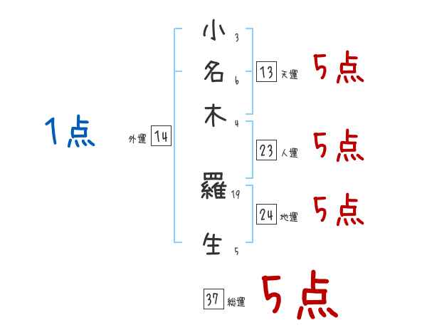 天運![]() | 小名木羅生さんの天運は13画の5つ星!才能に恵まれ人気がある。名声を手に入れる。円満な人生。 家系が持つ宿命的な運勢を表します。祖先から受け継いだ苗字ですので自分の力が及びません。家柄を象徴します。 |