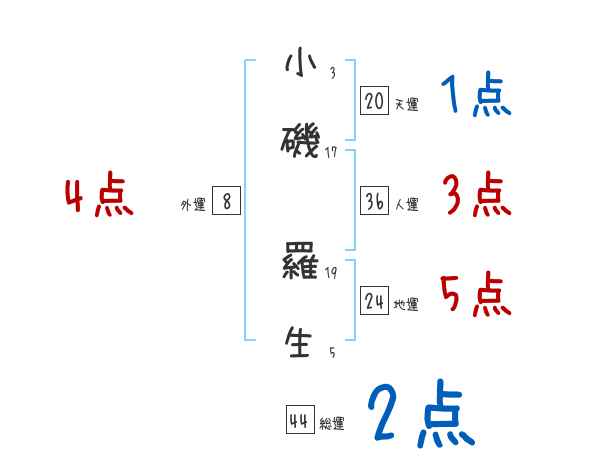 総運![]() | 小磯羅生さんの総運は44画の2つ星!誠実で慎重な性格。物事を考えすぎないように注意しましょう。 あなたの人生を表す1番重要な運勢です。生涯を通じて影響する総合運となり、主に50歳以降の晩年期に影響を及ぼします。 |