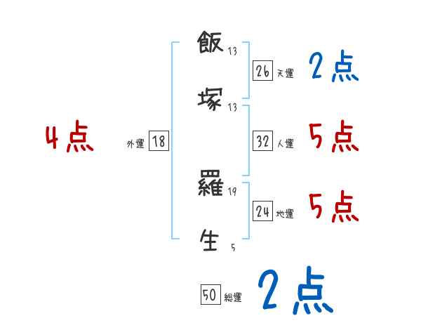 人運![]() | 飯塚羅生さんの人運は32画の5つ星!柔軟性があり成功する。チャンスが多く金運が良い。 性格や才能などを表す2番目に重要な運勢です。人間関係や協調性、社会的な成功に影響します。主に20歳から50歳ぐらいまでの中年期の運勢を表します。 |