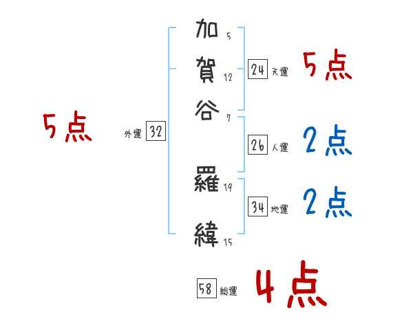 天運![]() | 加賀谷羅緯さんの天運は24画の5つ星!家庭運が良く順調な人生。金運にも恵まれる。 家系が持つ宿命的な運勢を表します。祖先から受け継いだ苗字ですので自分の力が及びません。家柄を象徴します。 |