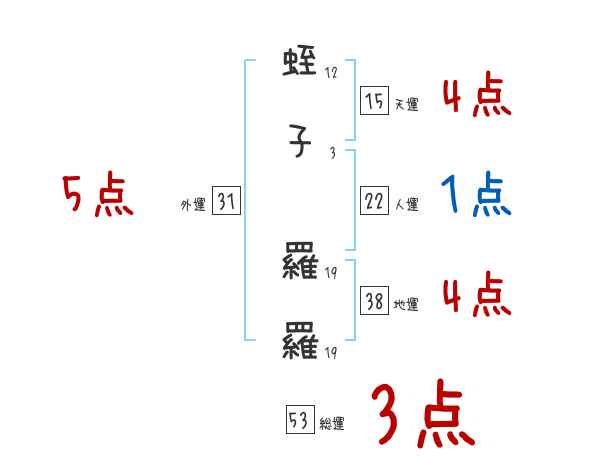 総運![]() | 蛭子羅羅さんの総運は53画の3つ星!やや見栄っ張りで虚栄心がある。散財に注意。 あなたの人生を表す1番重要な運勢です。生涯を通じて影響する総合運となり、主に50歳以降の晩年期に影響を及ぼします。 |
