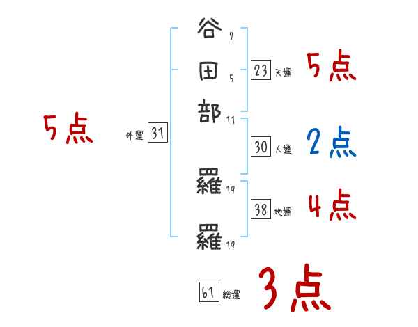天運![]() | 谷田部羅羅さんの天運は23画の5つ星!想像力に優れ活力がある。一代で成功し名誉を手に入れる。 家系が持つ宿命的な運勢を表します。祖先から受け継いだ苗字ですので自分の力が及びません。家柄を象徴します。 |
