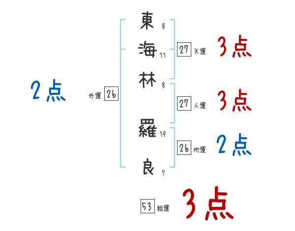 総運![]() | 東海林羅良さんの総運は53画の3つ星!やや見栄っ張りで虚栄心がある。散財に注意。 あなたの人生を表す1番重要な運勢です。生涯を通じて影響する総合運となり、主に50歳以降の晩年期に影響を及ぼします。 |