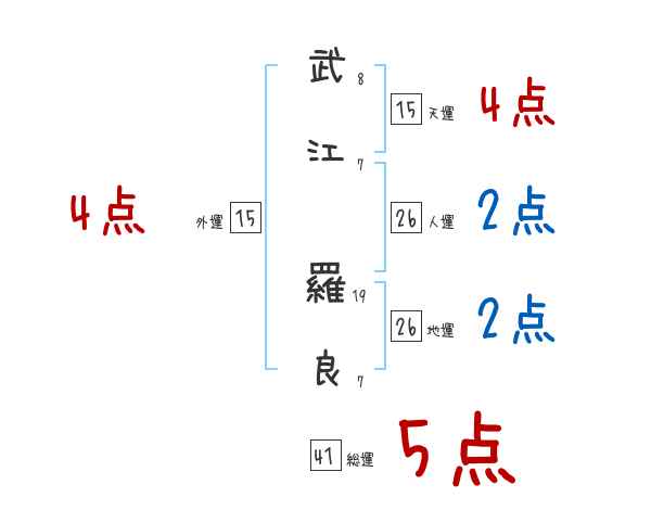 外運![]() | 武江羅良さんの外運は15画の4つ星!人徳があり出世する。順調に物事を進め円満な人生。 生活面を象徴する運勢です。外部から受ける影響力を表し、結婚運、家庭運や職場、環境への順応性を表します。 |