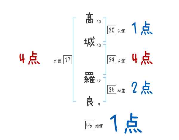 外運![]() | 髙城羅良さんの外運は17画の4つ星!積極的な行動力。地位を気づき財産を手に入れる。純粋な心と直感力。 生活面を象徴する運勢です。外部から受ける影響力を表し、結婚運、家庭運や職場、環境への順応性を表します。 |