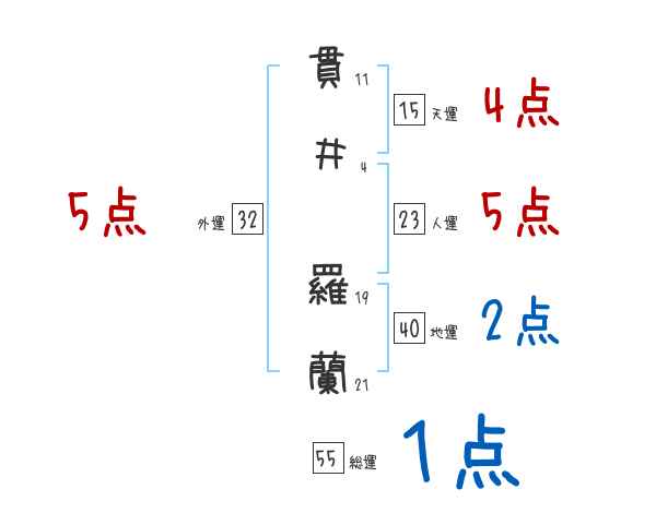 外運![]() | 貫井羅蘭さんの外運は32画の5つ星!柔軟性があり成功する。チャンスが多く金運が良い。 生活面を象徴する運勢です。外部から受ける影響力を表し、結婚運、家庭運や職場、環境への順応性を表します。 |