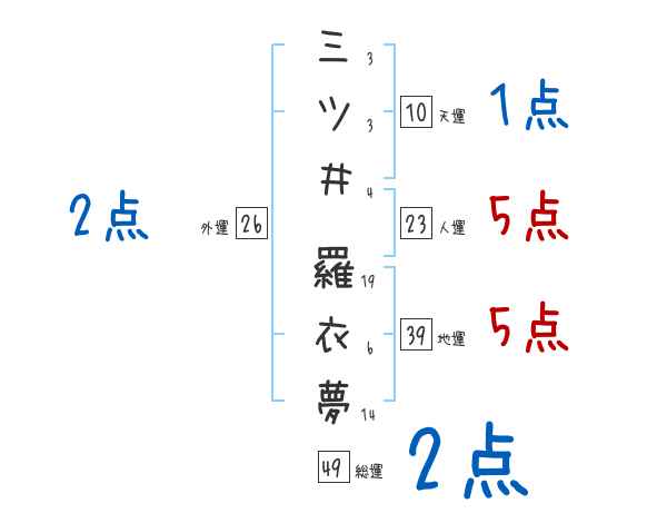 外運![]() | 三ツ井羅衣夢さんの外運は26画の2つ星!波瀾万丈かも。信頼できる人を大事にしましょう。 生活面を象徴する運勢です。外部から受ける影響力を表し、結婚運、家庭運や職場、環境への順応性を表します。 |