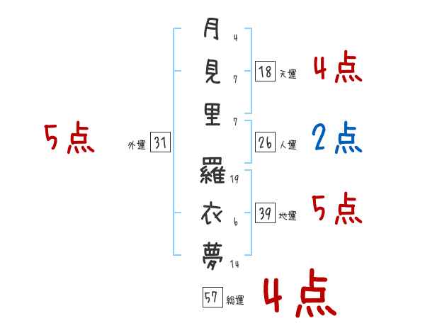 総運![]() | 月見里羅衣夢さんの総運は57画の4つ星!向上心があり人望がある。地位を得る。 あなたの人生を表す1番重要な運勢です。生涯を通じて影響する総合運となり、主に50歳以降の晩年期に影響を及ぼします。 |