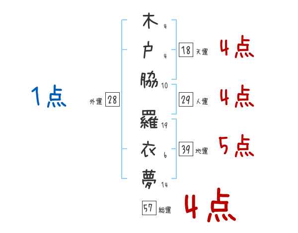 天運![]() | 木戸脇羅衣夢さんの天運は18画の4つ星!情熱的で剛気。忍耐力があり信頼される。 家系が持つ宿命的な運勢を表します。祖先から受け継いだ苗字ですので自分の力が及びません。家柄を象徴します。 |