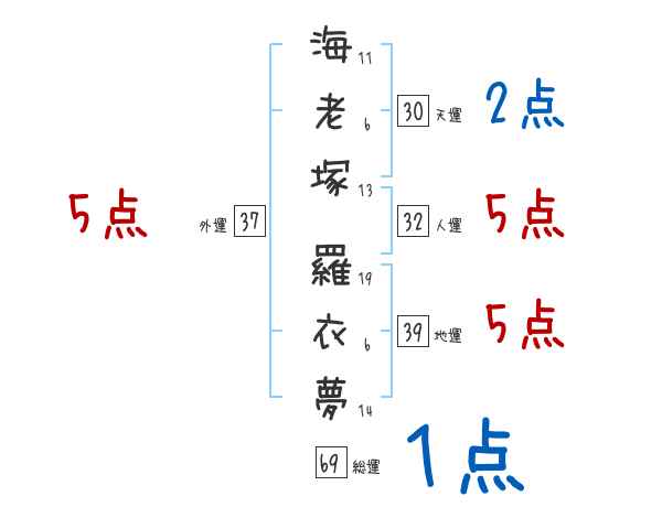 人運![]() | 海老塚羅衣夢さんの人運は32画の5つ星!柔軟性があり成功する。チャンスが多く金運が良い。 性格や才能などを表す2番目に重要な運勢です。人間関係や協調性、社会的な成功に影響します。主に20歳から50歳ぐらいまでの中年期の運勢を表します。 |