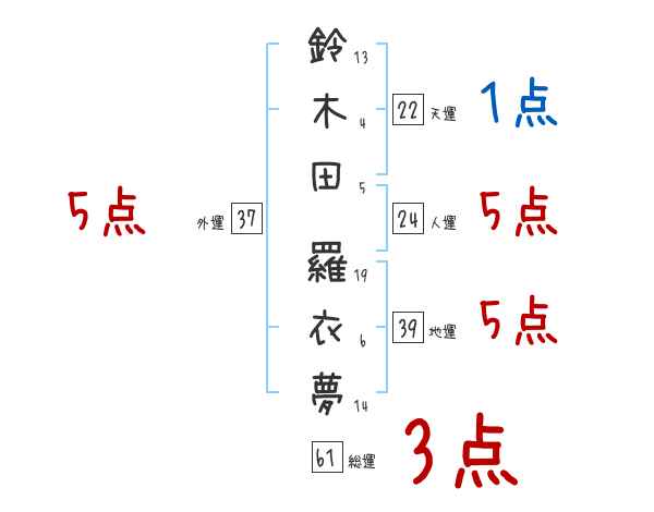 外運![]() | 鈴木田羅衣夢さんの外運は37画の5つ星!努力家で順応性に優れる。現実的な考え方ができ忠実に物事をこなす。 生活面を象徴する運勢です。外部から受ける影響力を表し、結婚運、家庭運や職場、環境への順応性を表します。 |