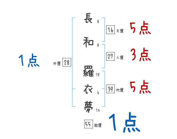 天運![]() | 長和羅衣夢さんの天運は16画の5つ星!人望が厚く大きく発展する。逆転成功が見える。 家系が持つ宿命的な運勢を表します。祖先から受け継いだ苗字ですので自分の力が及びません。家柄を象徴します。 |