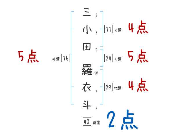 天運![]() | 三小田羅衣斗さんの天運は11画の4つ星!着実に富や地位を得る幸運な人生。 家系が持つ宿命的な運勢を表します。祖先から受け継いだ苗字ですので自分の力が及びません。家柄を象徴します。 |