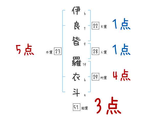 総運![]() | 伊良皆羅衣斗さんの総運は51画の3つ星!変化が激しく、危険に注意。堅実な性格。 あなたの人生を表す1番重要な運勢です。生涯を通じて影響する総合運となり、主に50歳以降の晩年期に影響を及ぼします。 |