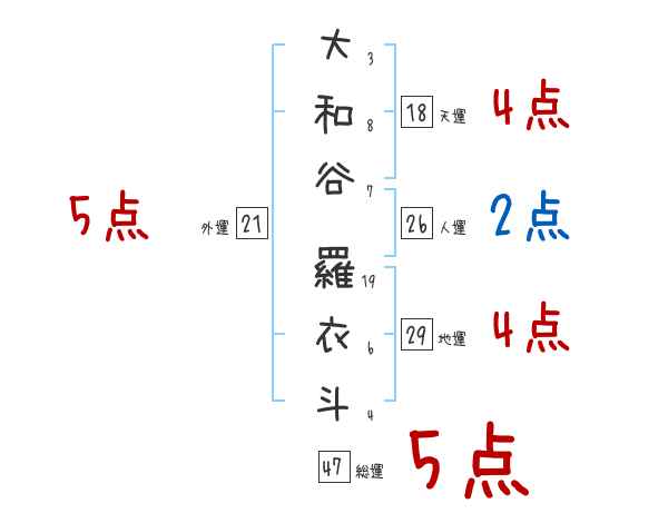 総運![]() | 大和谷羅衣斗さんの総運は47画の5つ星!実力が開花し発展する円満な人生。財に恵まれる。 あなたの人生を表す1番重要な運勢です。生涯を通じて影響する総合運となり、主に50歳以降の晩年期に影響を及ぼします。 |