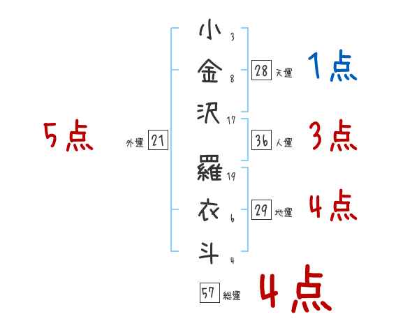 天運![]() | 小金沢羅衣斗さんの天運は28画の1つ星!家庭環境に注意。スポーツで活躍できる能力があるかも。 家系が持つ宿命的な運勢を表します。祖先から受け継いだ苗字ですので自分の力が及びません。家柄を象徴します。 |