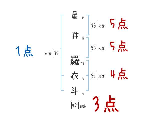 外運![]() | 星井羅衣斗さんの外運は19画の1つ星!優れた才能を持ちますが、協調性が足りないことも。周りの人と協力する事を意識しましょう。 生活面を象徴する運勢です。外部から受ける影響力を表し、結婚運、家庭運や職場、環境への順応性を表します。 |