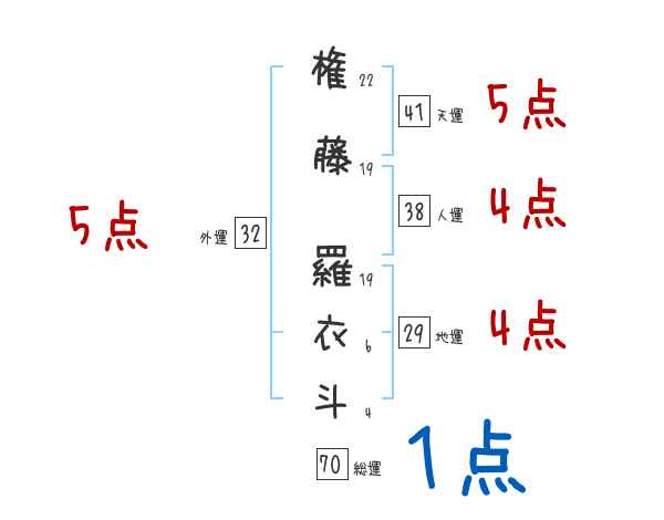 外運![]() | 権藤羅衣斗さんの外運は32画の5つ星!柔軟性があり成功する。チャンスが多く金運が良い。 生活面を象徴する運勢です。外部から受ける影響力を表し、結婚運、家庭運や職場、環境への順応性を表します。 |