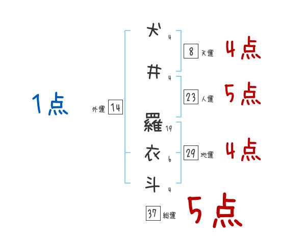 人運![]() | 犬井羅衣斗さんの人運は23画の5つ星!想像力に優れ活力がある。一代で成功し名誉を手に入れる。 性格や才能などを表す2番目に重要な運勢です。人間関係や協調性、社会的な成功に影響します。主に20歳から50歳ぐらいまでの中年期の運勢を表します。 |