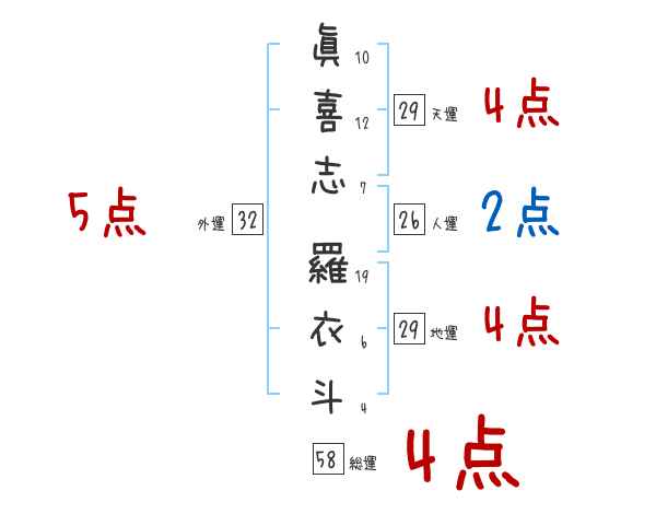 外運![]() | 眞喜志羅衣斗さんの外運は32画の5つ星!柔軟性があり成功する。チャンスが多く金運が良い。 生活面を象徴する運勢です。外部から受ける影響力を表し、結婚運、家庭運や職場、環境への順応性を表します。 |