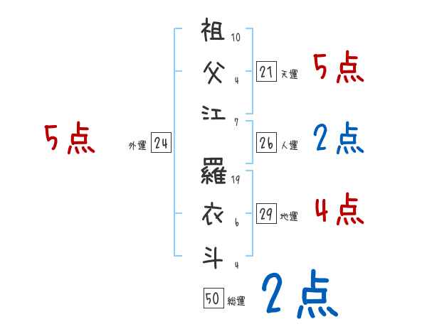 外運![]() | 祖父江羅衣斗さんの外運は24画の5つ星!家庭運が良く順調な人生。金運にも恵まれる。 生活面を象徴する運勢です。外部から受ける影響力を表し、結婚運、家庭運や職場、環境への順応性を表します。 |