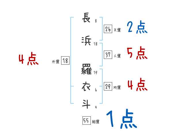 天運![]() | 長浜羅衣斗さんの天運は26画の2つ星!波瀾万丈かも。信頼できる人を大事にしましょう。 家系が持つ宿命的な運勢を表します。祖先から受け継いだ苗字ですので自分の力が及びません。家柄を象徴します。 |