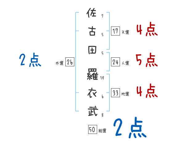 総運![]() | 佐古田羅衣武さんの総運は50画の2つ星!浮き沈みが激しく不安定。しりすぼみに衰退しやすいので注意しましょう。 あなたの人生を表す1番重要な運勢です。生涯を通じて影響する総合運となり、主に50歳以降の晩年期に影響を及ぼします。 |