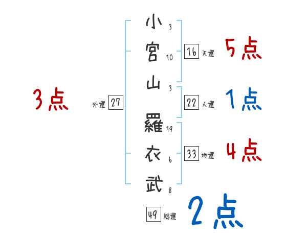 人運![]() | 小宮山羅衣武さんの人運は22画の1つ星!努力することが苦手ないっぽう手先が器用。芸術性にも優れる。 性格や才能などを表す2番目に重要な運勢です。人間関係や協調性、社会的な成功に影響します。主に20歳から50歳ぐらいまでの中年期の運勢を表します。 |