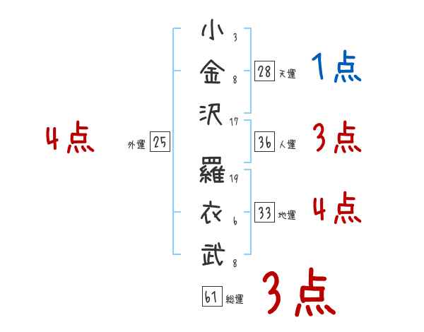 地運![]() | 小金沢羅衣武さんの地運は33画の4つ星!権力志向でプライドが高い。勇気があり運を切り開き成功する。 個性を表す基礎的な運勢です。性格形成や対人関係、行動力など家庭環境に影響されます。主に誕生してから20歳くらいまでの若年期の運勢を表します。 |