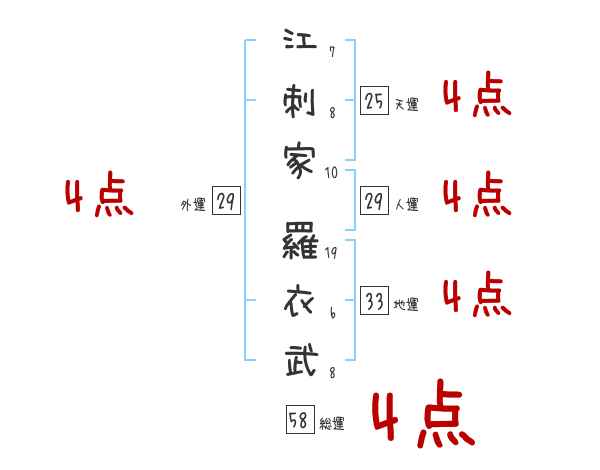 総運![]() | 江刺家羅衣武さんの総運は58画の4つ星!安定した生活。大器晩成タイプ。 あなたの人生を表す1番重要な運勢です。生涯を通じて影響する総合運となり、主に50歳以降の晩年期に影響を及ぼします。 |