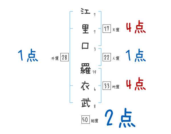 総運![]() | 江里口羅衣武さんの総運は50画の2つ星!浮き沈みが激しく不安定。しりすぼみに衰退しやすいので注意しましょう。 あなたの人生を表す1番重要な運勢です。生涯を通じて影響する総合運となり、主に50歳以降の晩年期に影響を及ぼします。 |
