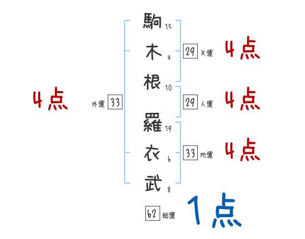 外運![]() | 駒木根羅衣武さんの外運は33画の4つ星!権力志向でプライドが高い。勇気があり運を切り開き成功する。 生活面を象徴する運勢です。外部から受ける影響力を表し、結婚運、家庭運や職場、環境への順応性を表します。 |