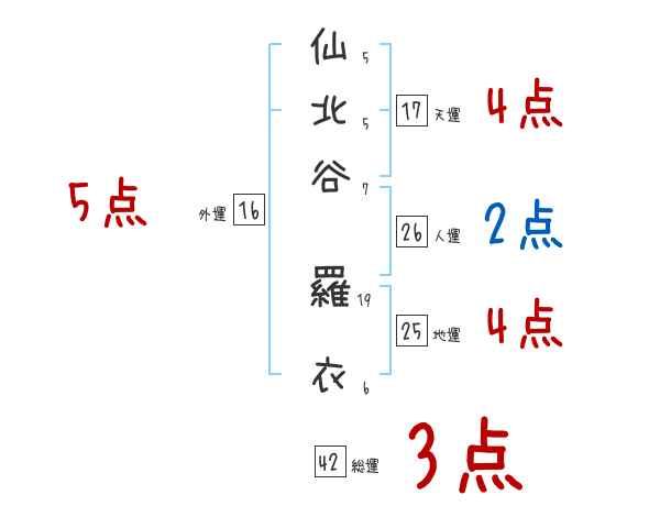 外運![]() | 仙北谷羅衣さんの外運は16画の5つ星!人望が厚く大きく発展する。逆転成功が見える。 生活面を象徴する運勢です。外部から受ける影響力を表し、結婚運、家庭運や職場、環境への順応性を表します。 |