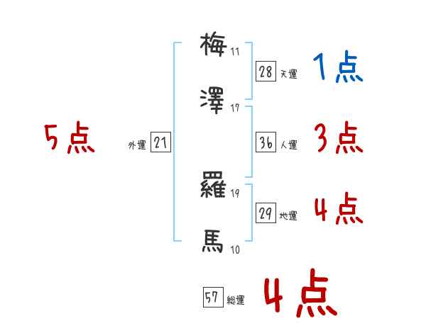 天運![]() | 梅澤羅馬さんの天運は28画の1つ星!家庭環境に注意。スポーツで活躍できる能力があるかも。 家系が持つ宿命的な運勢を表します。祖先から受け継いだ苗字ですので自分の力が及びません。家柄を象徴します。 |