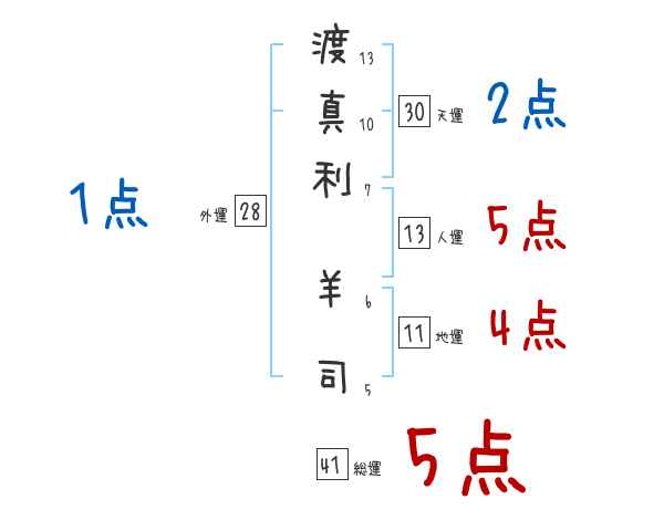 天運![]() | 渡真利羊司さんの天運は30画の2つ星!浮き沈みの激しさに注意しましょう。 家系が持つ宿命的な運勢を表します。祖先から受け継いだ苗字ですので自分の力が及びません。家柄を象徴します。 |