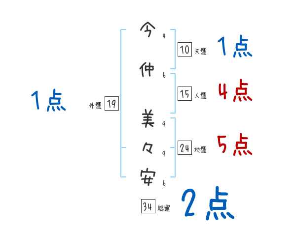 天運![]() | 今仲美々安さんの天運は10画の1つ星!不安を感じやすい傾向。ストレスを抱えないように注意しましょう。 家系が持つ宿命的な運勢を表します。祖先から受け継いだ苗字ですので自分の力が及びません。家柄を象徴します。 |