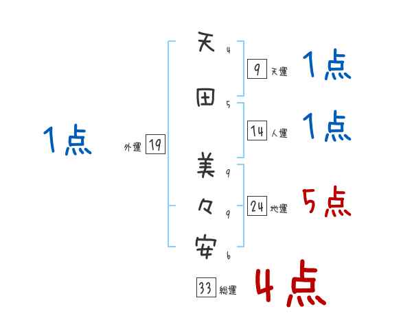 天運![]() | 天田美々安さんの天運は9画の1つ星!消極的で才能を発揮することが苦手なことも。周りの意見に耳を傾けましょう。 家系が持つ宿命的な運勢を表します。祖先から受け継いだ苗字ですので自分の力が及びません。家柄を象徴します。 |