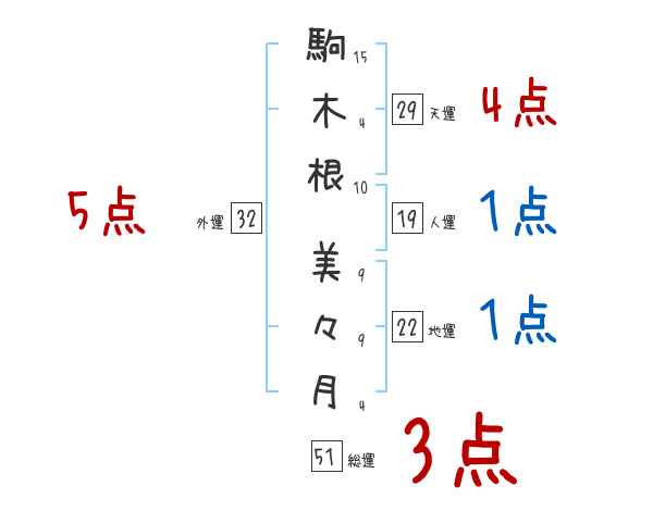 外運![]() | 駒木根美々月さんの外運は32画の5つ星!柔軟性があり成功する。チャンスが多く金運が良い。 生活面を象徴する運勢です。外部から受ける影響力を表し、結婚運、家庭運や職場、環境への順応性を表します。 |