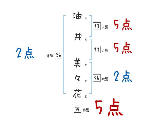総運![]() | 油井美々花さんの総運は39画の5つ星!社交性に優れ人望が厚い。人の上に立ち成功する。 あなたの人生を表す1番重要な運勢です。生涯を通じて影響する総合運となり、主に50歳以降の晩年期に影響を及ぼします。 |