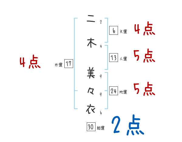 外運![]() | 二木美々衣さんの外運は17画の4つ星!積極的な行動力。地位を気づき財産を手に入れる。純粋な心と直感力。 生活面を象徴する運勢です。外部から受ける影響力を表し、結婚運、家庭運や職場、環境への順応性を表します。 |