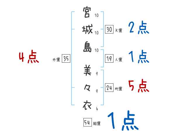 天運![]() | 宮城島美々衣さんの天運は30画の2つ星!浮き沈みの激しさに注意しましょう。 家系が持つ宿命的な運勢を表します。祖先から受け継いだ苗字ですので自分の力が及びません。家柄を象徴します。 |