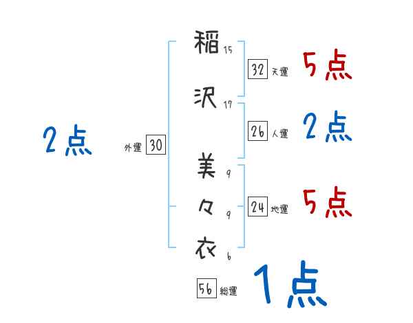 天運![]() | 稲沢美々衣さんの天運は32画の5つ星!柔軟性があり成功する。チャンスが多く金運が良い。 家系が持つ宿命的な運勢を表します。祖先から受け継いだ苗字ですので自分の力が及びません。家柄を象徴します。 |