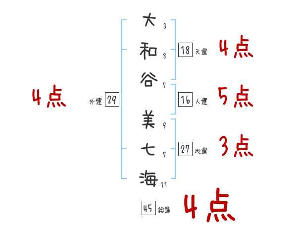 天運![]() | 大和谷美七海さんの天運は18画の4つ星!情熱的で剛気。忍耐力があり信頼される。 家系が持つ宿命的な運勢を表します。祖先から受け継いだ苗字ですので自分の力が及びません。家柄を象徴します。 |