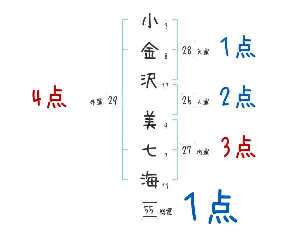 天運![]() | 小金沢美七海さんの天運は28画の1つ星!家庭環境に注意。スポーツで活躍できる能力があるかも。 家系が持つ宿命的な運勢を表します。祖先から受け継いだ苗字ですので自分の力が及びません。家柄を象徴します。 |
