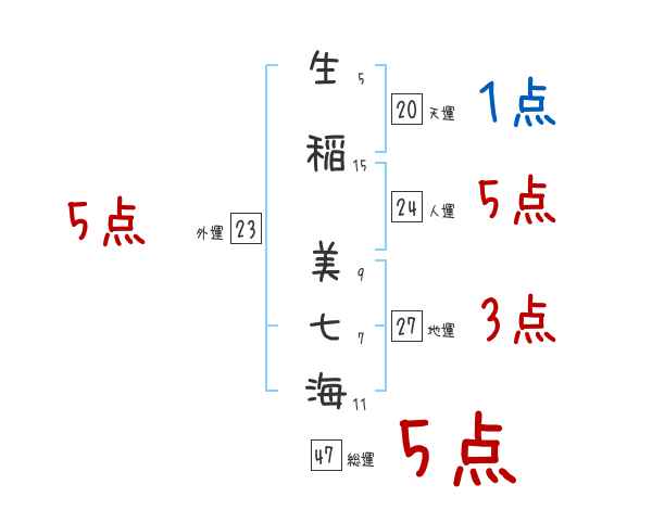 総運![]() | 生稲美七海さんの総運は47画の5つ星!実力が開花し発展する円満な人生。財に恵まれる。 あなたの人生を表す1番重要な運勢です。生涯を通じて影響する総合運となり、主に50歳以降の晩年期に影響を及ぼします。 |