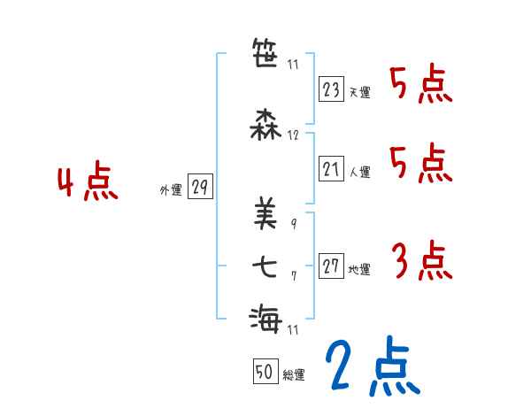 総運![]() | 笹森美七海さんの総運は50画の2つ星!浮き沈みが激しく不安定。しりすぼみに衰退しやすいので注意しましょう。 あなたの人生を表す1番重要な運勢です。生涯を通じて影響する総合運となり、主に50歳以降の晩年期に影響を及ぼします。 |