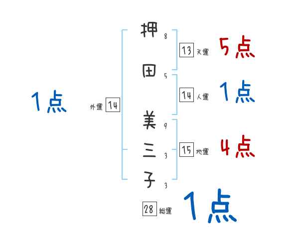 外運![]() | 押田美三子さんの外運は14画の1つ星!人に対して優しいがストレスを溜め込みがち。人間関係のトラブルを避けるよう気をつけましょう。 生活面を象徴する運勢です。外部から受ける影響力を表し、結婚運、家庭運や職場、環境への順応性を表します。 |