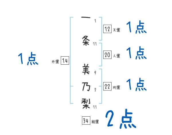 天運![]() | 一条美乃梨さんの天運は12画の1つ星!簡単な失敗で諦めてしまいやすいかも。着実に行動すると良いでしょう。 家系が持つ宿命的な運勢を表します。祖先から受け継いだ苗字ですので自分の力が及びません。家柄を象徴します。 |