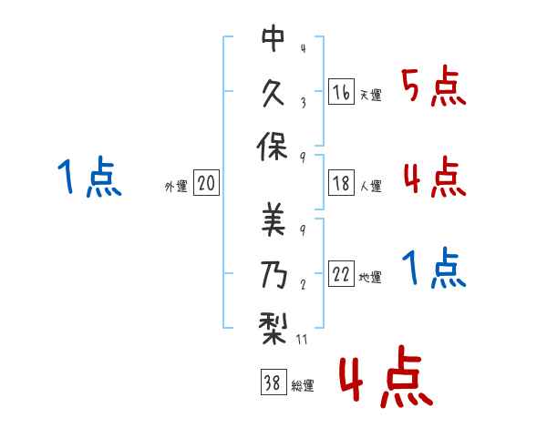天運![]() | 中久保美乃梨さんの天運は16画の5つ星!人望が厚く大きく発展する。逆転成功が見える。 家系が持つ宿命的な運勢を表します。祖先から受け継いだ苗字ですので自分の力が及びません。家柄を象徴します。 |